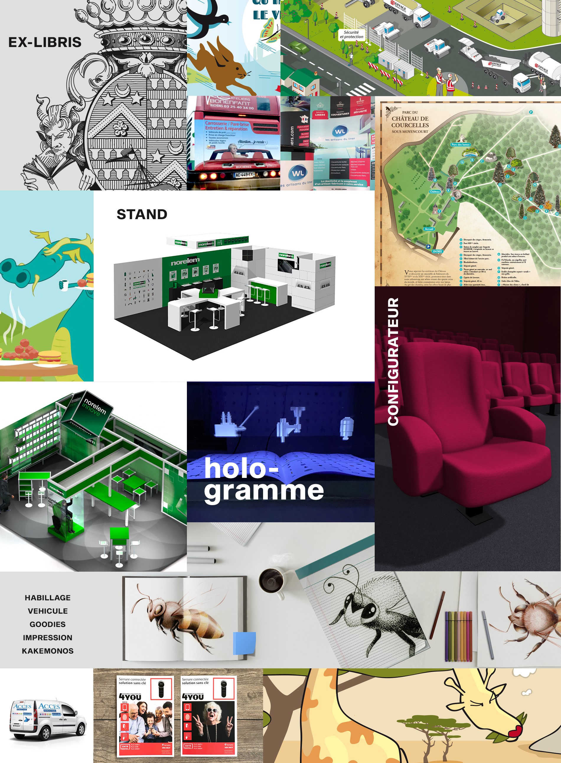 Dessin d’ex-libris, illustrations de livres pour enfants, plan de parc de lamas, agencement de stands d’exposition, hologrammes, configurateur 3D de produits, design d’objets, illustration isométrique, film d’animation 2D et 3D, puzzle géant...