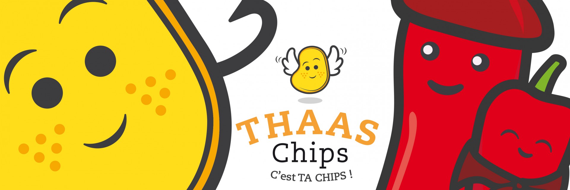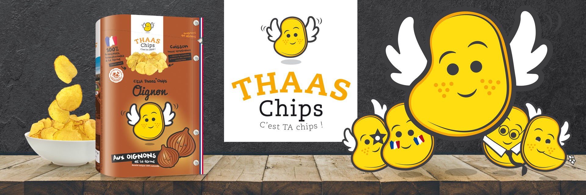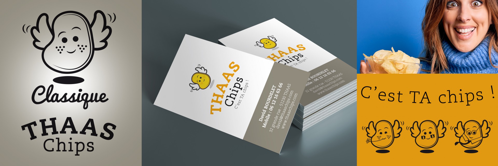 Une collaboration étroite et humaine et leur confiance dans nos axes créatifs ont donné naissance à Chipette le logo mascotte de l'entreprise Thaas Chips !
